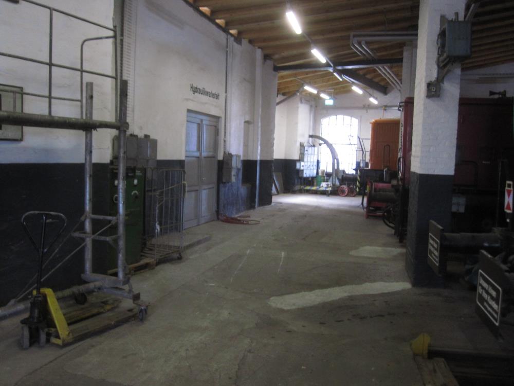 Das Bild zeigt den hinteren Schuppenteil. In der Wand ist eine Doppeltür zu erkennen, die früher die sogenannte Hydraulikwerkstatt abschloss. In der Werkstatt wurden zu Betriebszeiten hydraulische Anlagen von Lokomotiven, Baggern und Flurförderfahrzeugen gewartet. Das im Hintergrund erkennbare Fenster teilt die betriebseigene Tischlerwerkstatt vom Lokschuppen ab.