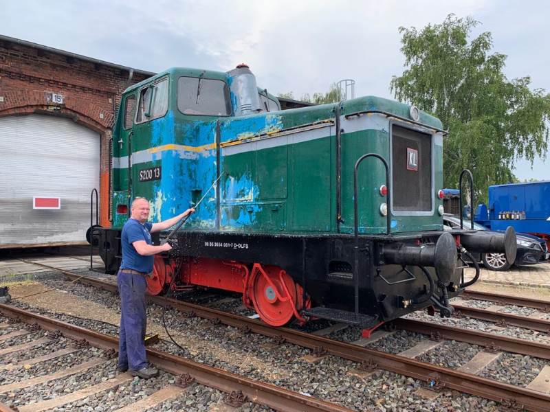 Auch kosmetische Eingriffe müssen von Zeit zu Zeit sein. Auf dem folgenden Bild sehen wir die Diesellok S 200, die bisher ein provisorisches grünes Farbkleid trug. Das war allerdings schon ein wenig in die Jahre gekommen und wurde daher mit einem Hochdruckreiniger so gut wie möglich entfernt. Darunter kam die vorherige hellblaue Farbgebung zum Vorschein. Die soll allerdings auch nicht dauerhaft erhalten bleiben. Wir planen, die Lok purpurrot mit hellerem Zierstreifen zu lackieren.