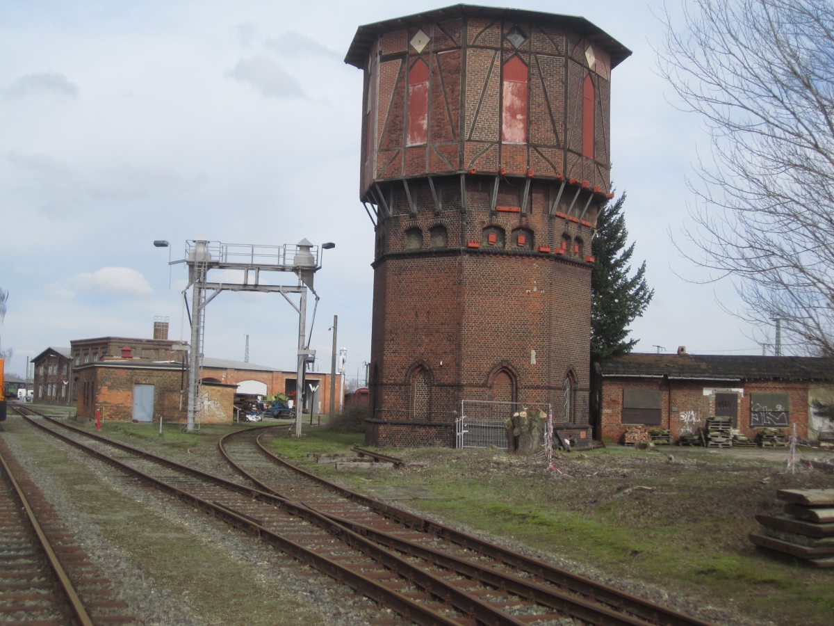 Das markante Bauwerk besteht aus drei wesentlichen Teilen, von denen nur zwei äußerlich sichtbar sind. Er dient zur Versorgung von Dampflokomotiven, die zur Erzeugung des Dampfes jede Menge Wasser benötigen und das regelmäßig "getankt" werden muss. Der Turm beherbergt in dem breiten oberen Teil einen stählernen Behälter, der ca. 200 m³ Wasser fassen kann. Da sich der Behälter auf 12 Meter Höhe befindet, beträgt der Wasserdruck am Boden des Turms also etwas mehr als ein Bar, je nachdem wie hoch der Behälter gefüllt ist. Wagen wir mal gemeinsam einen Blick hinein: