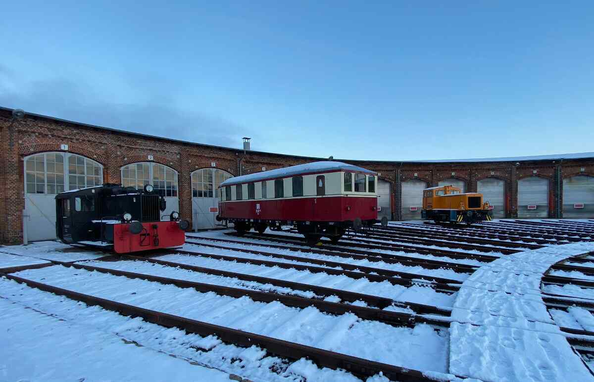 Ein paar kleinere Fahrzeuge dürfen ein wenig Winterluft schnuppern, weil ihr Gleis im Lokschuppen derzeit anderweitig belegt ist.