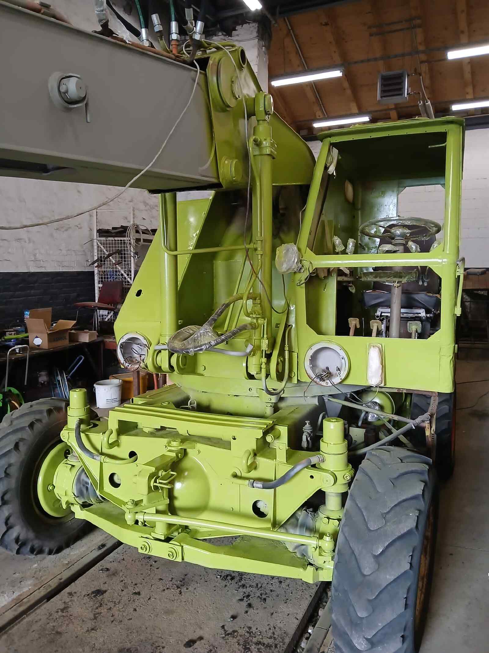 Fortschritte macht zu Glück auch unser Bagger T174. Nachdem nun alle Arbeiten an seinem Innenleben und seinem Blechkleid abgeschlossen wurden, wird er derzeit lackiert in der typisch grünen Farbe, an die sich der ein oder andere vielleicht noch aus DDR-Zeiten erinnert. Nun müssen noch die neuen bzw. aufbereiteten Scheiben und die Lampen eingebaut werden. Zuletzt wird er noch beschriftet und steht uns dann hoffentlich wieder für eine lange Zeit für Arbeiten im Museum zur Verfügung.