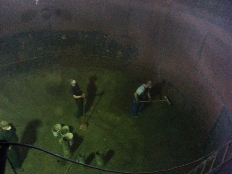 Das Bild zeigt die Arbeiten im Inneren des Wasserbehälters, der sich unter dem Dach des Wasserturms in einer Höhe von 12 bis 17 Metern befindet. Er ist ungefähr fünf Meter hoch und hat einen Durchmesser von ca. 8 Metern. In der Mitte erkennt man drei Fallrohre, die das Wasser aus dem Behälter senkrecht durch den Turm in dessen Fundament leiten, von wo aus es an verschiedene Entnahmestellen geleitet wird. Die Bildqualität bitten wir zu entschuldigen. Sie ist der Dunkelheit und Staubbelastung der Luft geschuldet.
