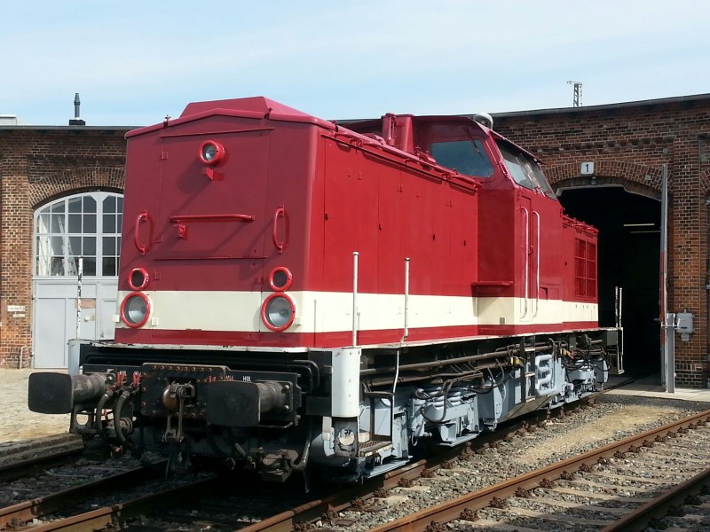 Der Verein hat freundlicherweise als Dauerleihgabe die Diesellok 345 072 von der Mitteldeutschen Eisenbahn erhalten. Wir möchten sie gerne in dem Zustand 1992/1993 präsentieren. Daher haben wir die Lok neu lackiert: Der Aufbau der Lok erstrahlt in einem leuchtenden gelborange, das Fahrwerk in grau. Die Lok verfügt über ein Rangiergeländer an den Endbühnen. Hier ein Bild vom 3.10.2013 nach Lackierung der Hauptkomponenten. Die Lok wird erstmals zum nächsten Lokschuppenfest am 12./13.10.2013 präsentiert.