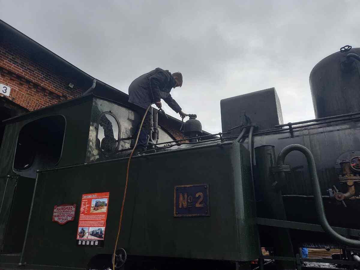 Nachdem sich die Aktiven eine Woche ausgeruht hatten, ging es aber bereits am vergangenen Wochenende weiter. So werden nun nach und nach unsere Dampfloks winterfest gemacht. Das bedeutet, dass insbesondere das Wasser aus dem Kesseln, Vorratsbehältern und Leitungen abgelassen werden muss, um Frostschäden im Winter zu vermeiden. Die Kessel müssen auch von innen und außen gereinigt werden. Letztes Wochenende war Lok „Emma“ zu Behandlung.